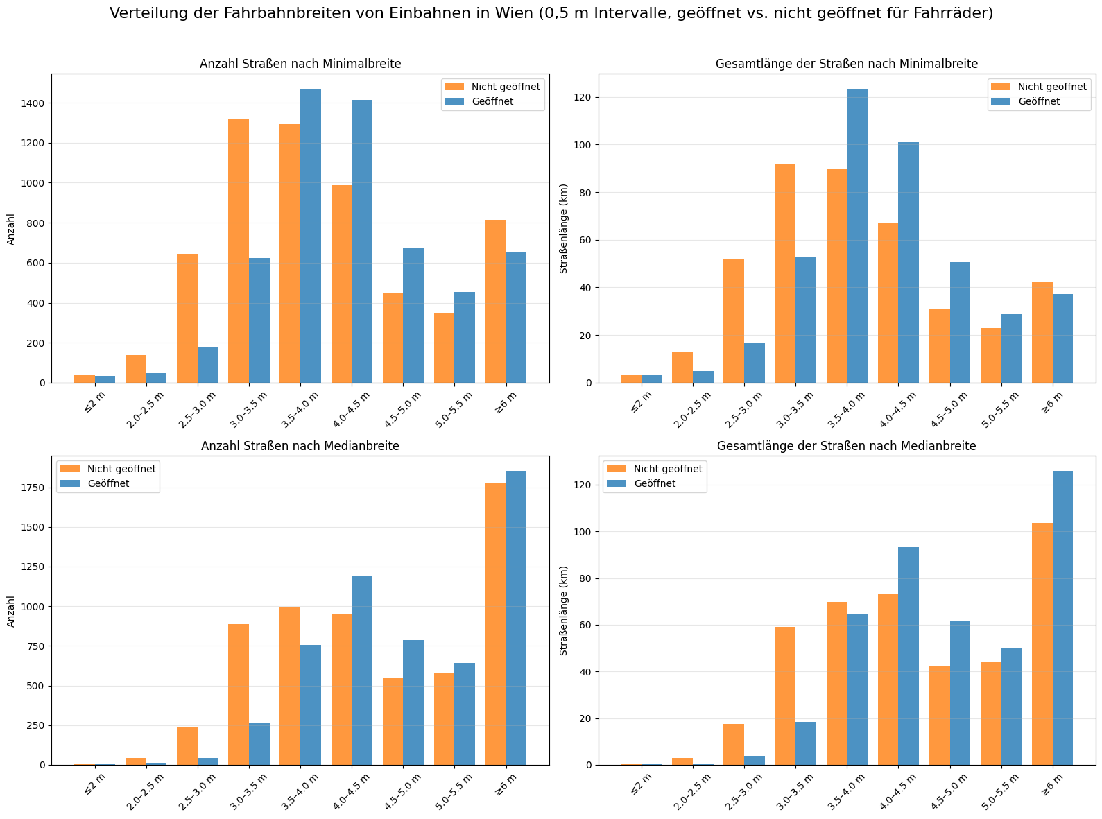 Einmal laufen lassen für alle Tempo-30-Einbahnen in Wien. Zusätzlich zur Mindestbreite noch die Medianbreite (Medianlänge aller senkrechten Liniensegmente) berechnen und voilà: